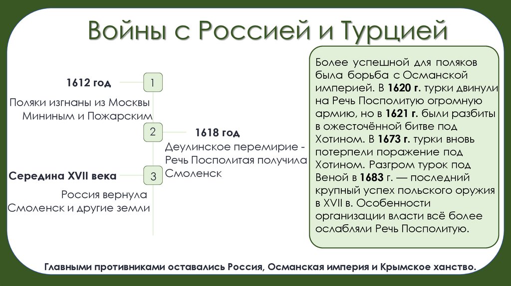 Главными противниками оставались Россия, Османская империя и Крымское ханство.