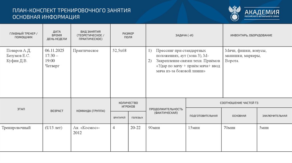 ПЛАН-КОНСПЕКТ ТРЕНИРОВОЧНОГО ЗАНЯТИЯОСНОВНАЯ ИНФОРМАЦИЯ