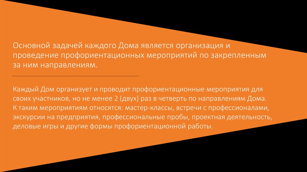 Основной задачей каждого Дома является организация ипроведение профориентационных мероприятий по закрепленным
