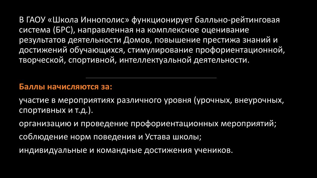 В ГАОУ «Школа Иннополис» функционирует балльно-рейтинговаясистема (БРС), направленная на комплексное оценивание