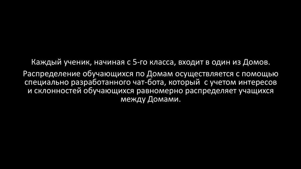 Каждый ученик, начиная с 5-го класса, входит в один из Домов.Распределение обучающихся по Домам осуществляется с помощью