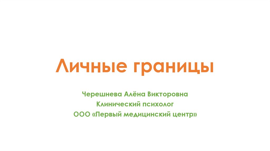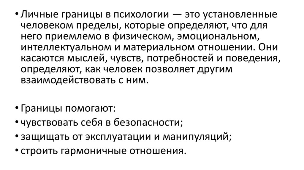 • Личные границы в психологии — это установленныечеловеком пределы, которые определяют, что для