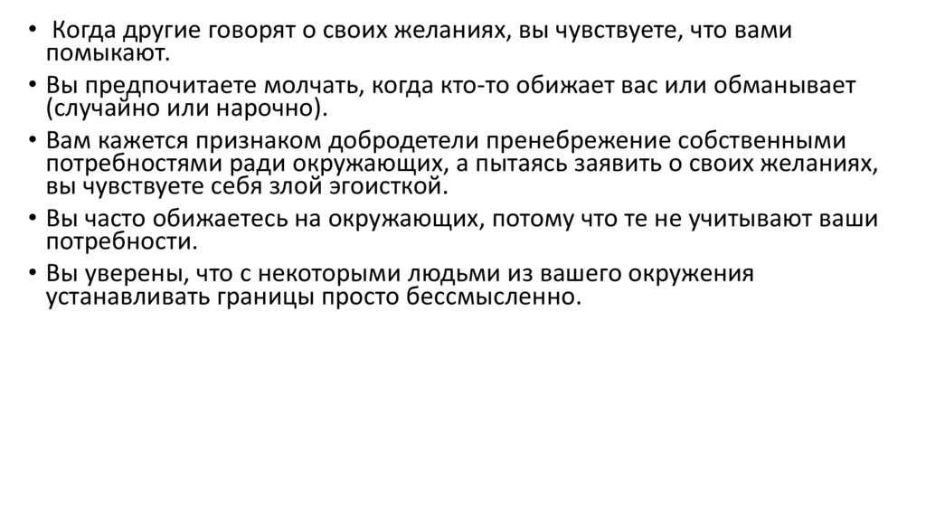 • Когда другие говорят о своих желаниях, вы чувствуете, что вамипомыкают.