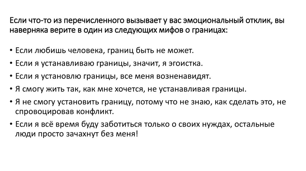 Если что-то из перечисленного вызывает у вас эмоциональный отклик, вынаверняка верите в один из следующих мифов о границах: