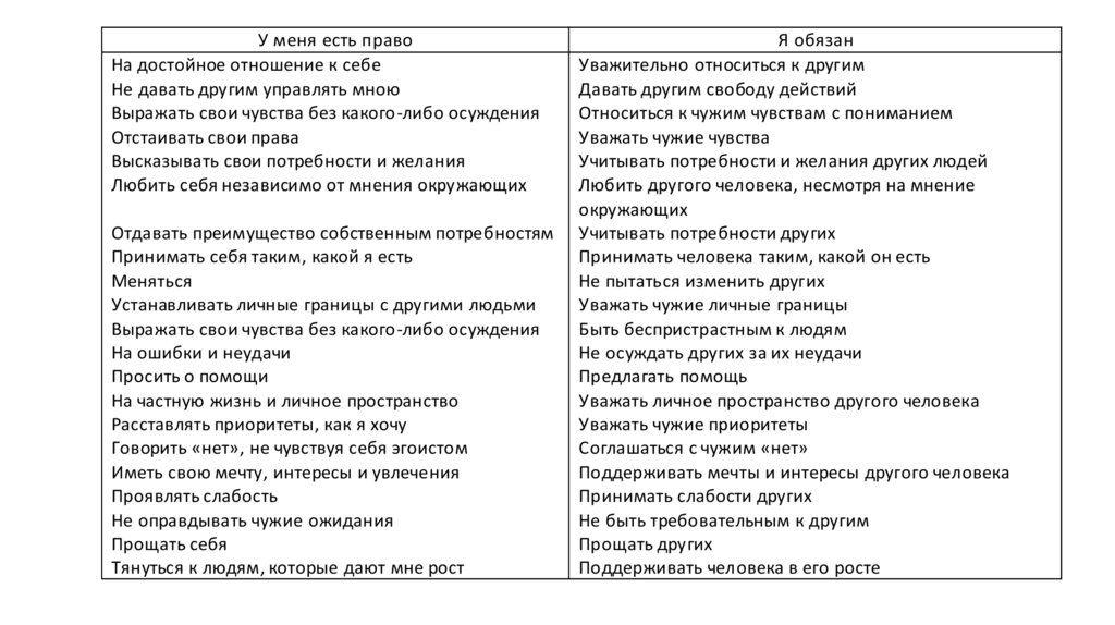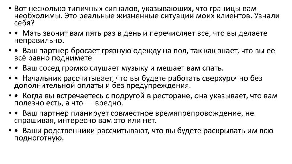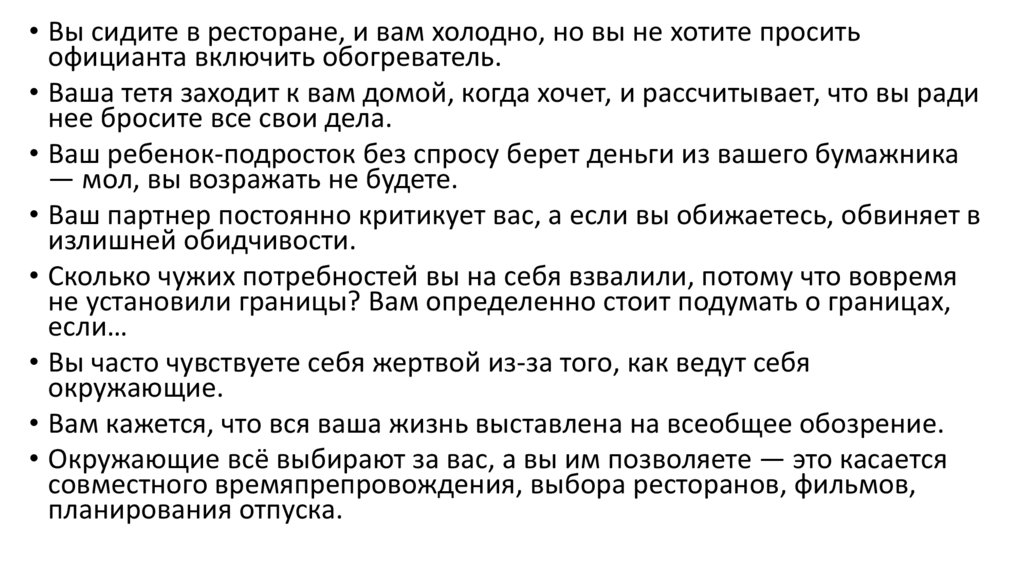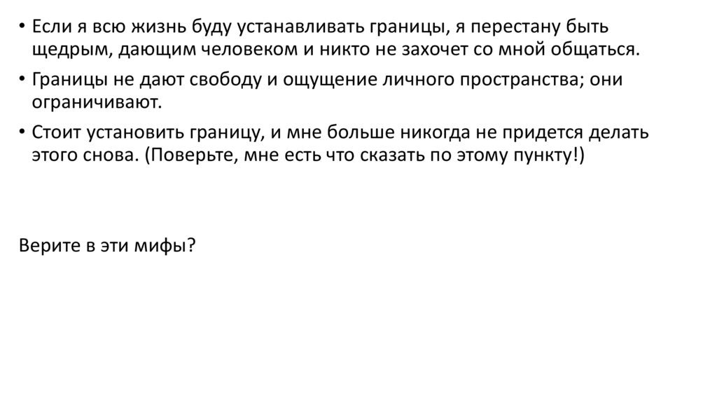 • Если я всю жизнь буду устанавливать границы, я перестану бытьщедрым, дающим человеком и никто не захочет со мной общаться.
