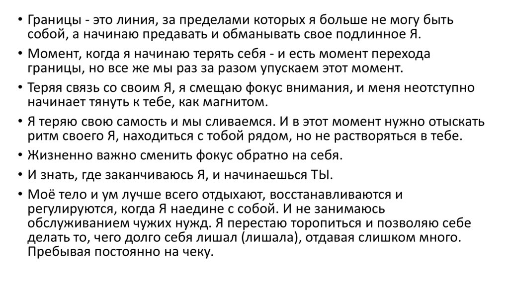 • Границы - это линия, за пределами которых я больше не могу бытьсобой, а начинаю предавать и обманывать свое подлинное Я.