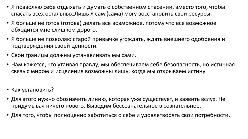 • Я позволяю себе отдыхать и думать о собственном спасении, вместо того, чтобыспасать всех остальных.Лишь Я сам (сама) могу восстановить свои ресурсы.
