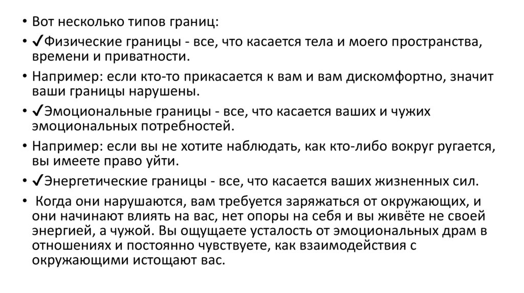 • Вот несколько типов границ:• ✔Физические границы - все, что касается тела и моего пространства,