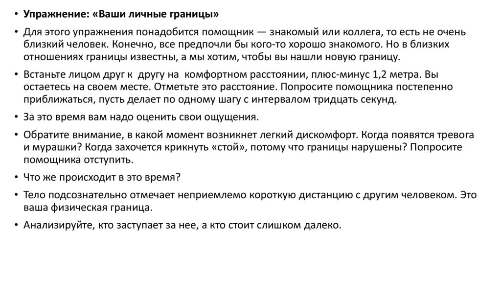 • Упражнение: «Ваши личные границы»• Для этого упражнения понадобится помощник — знакомый или коллега, то есть не очень