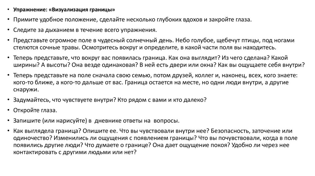 • Упражнение: «Визуализация границы»• Примите удобное положение, сделайте несколько глубоких вдохов и закройте глаза.