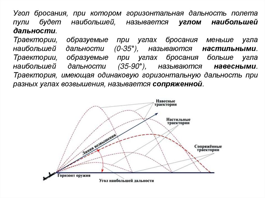 Угол бросания, при котором горизонтальная дальность полетапули будет наибольшей, называется углом наибольшей