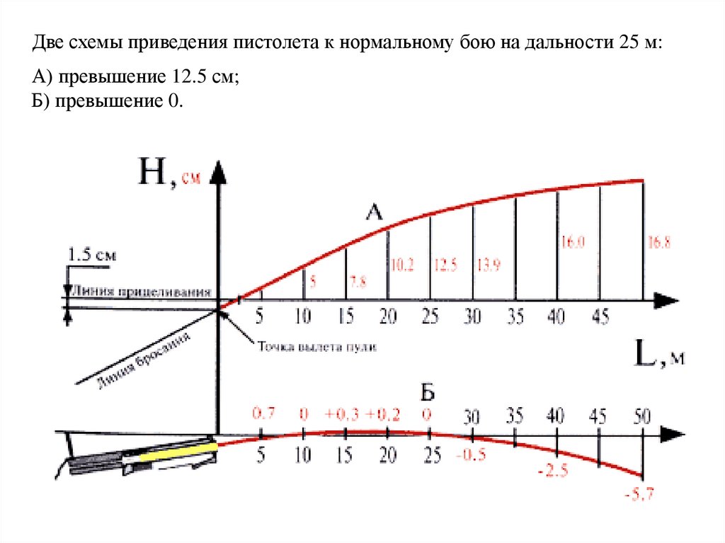 Две схемы приведения пистолета к нормальному бою на дальности 25 м:А) превышение 12.5 см;