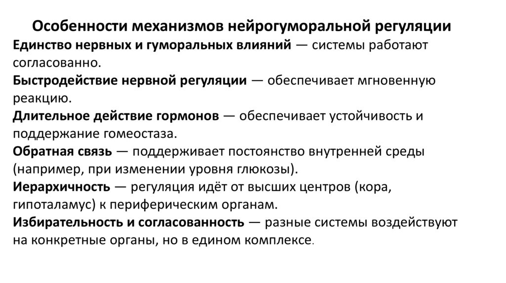 Особенности механизмов нейрогуморальной регуляцииЕдинство нервных и гуморальных влияний — системы работают