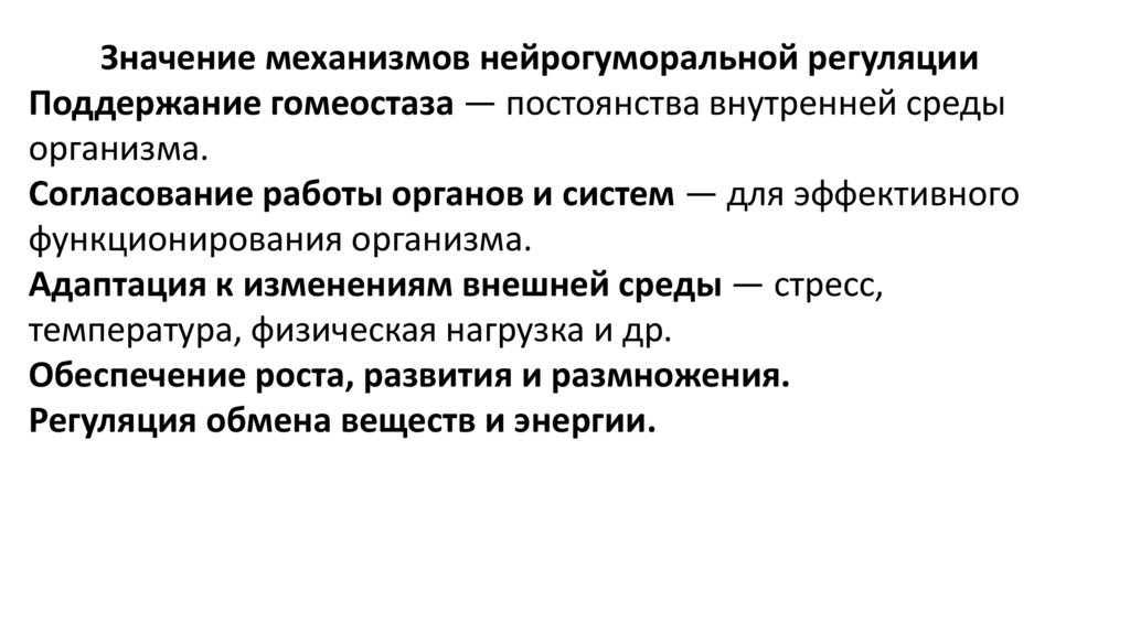 Значение механизмов нейрогуморальной регуляцииПоддержание гомеостаза — постоянства внутренней среды