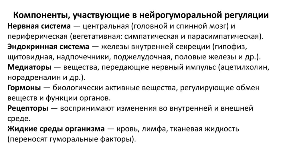 Компоненты, участвующие в нейрогуморальной регуляцииНервная система — центральная (головной и спинной мозг) и