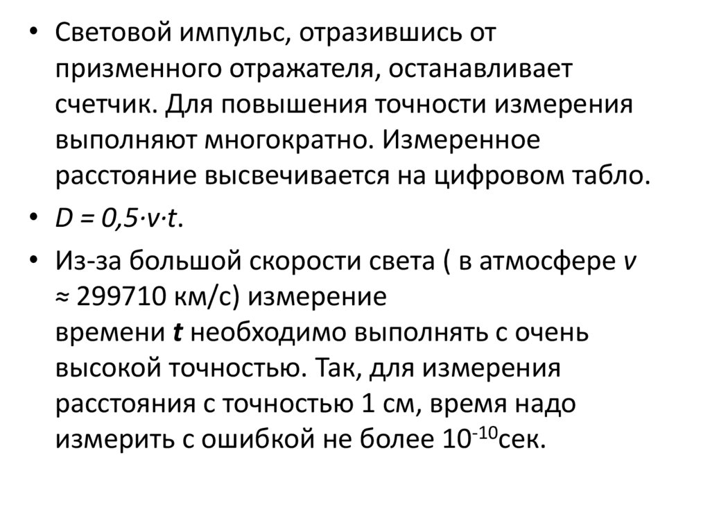 • Световой импульс, отразившись отпризменного отражателя, останавливает