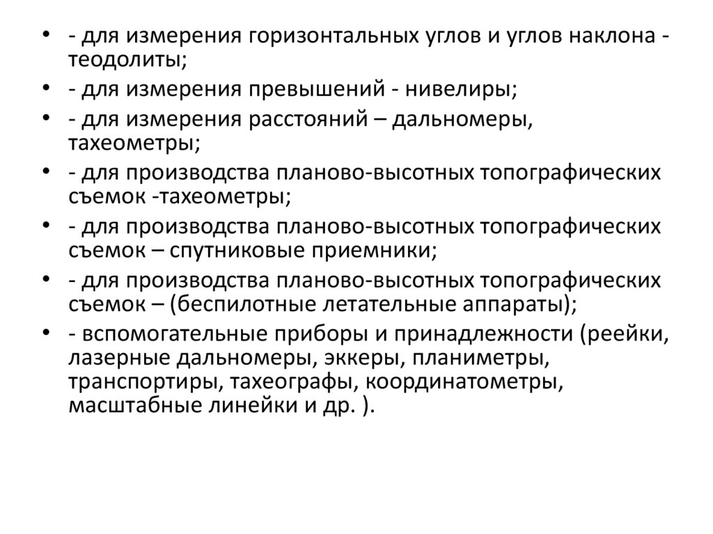 • - для измерения горизонтальных углов и углов наклона теодолиты;• - для измерения превышений - нивелиры;