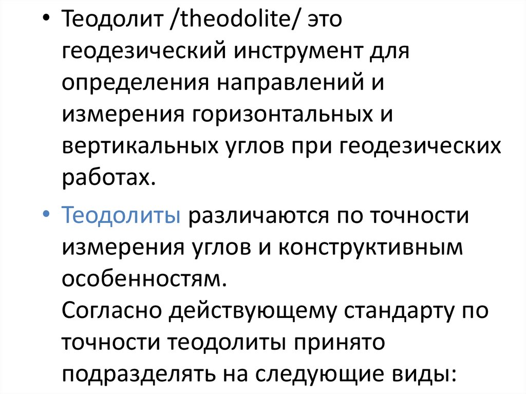 • Теодолит /theodolite/ этогеодезический инструмент для