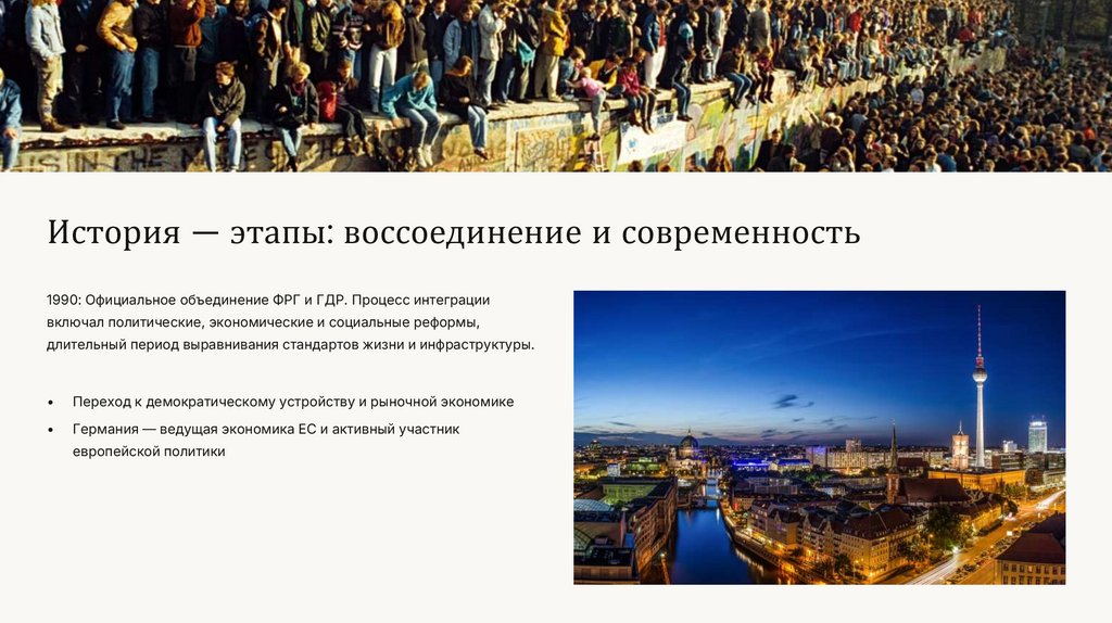 История — этапы: воссоединение и современность1990: Официальное объединение ФРГ и ГДР. Процесс интеграции