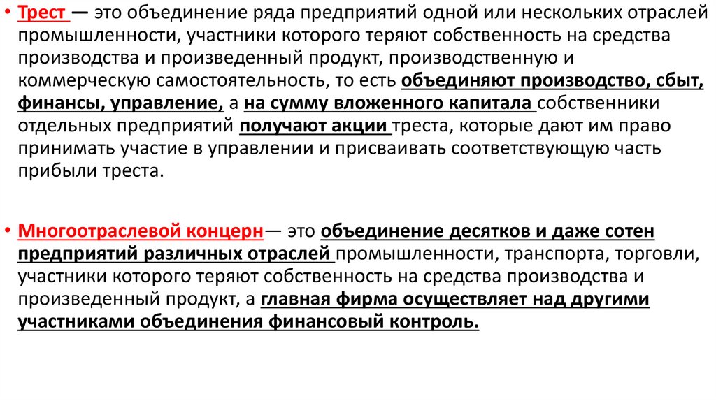 • Трест — это объединение ряда предприятий одной или нескольких отраслейпромышленности, участники которого теряют собственность на средства