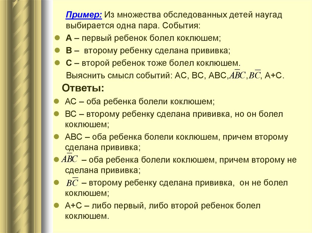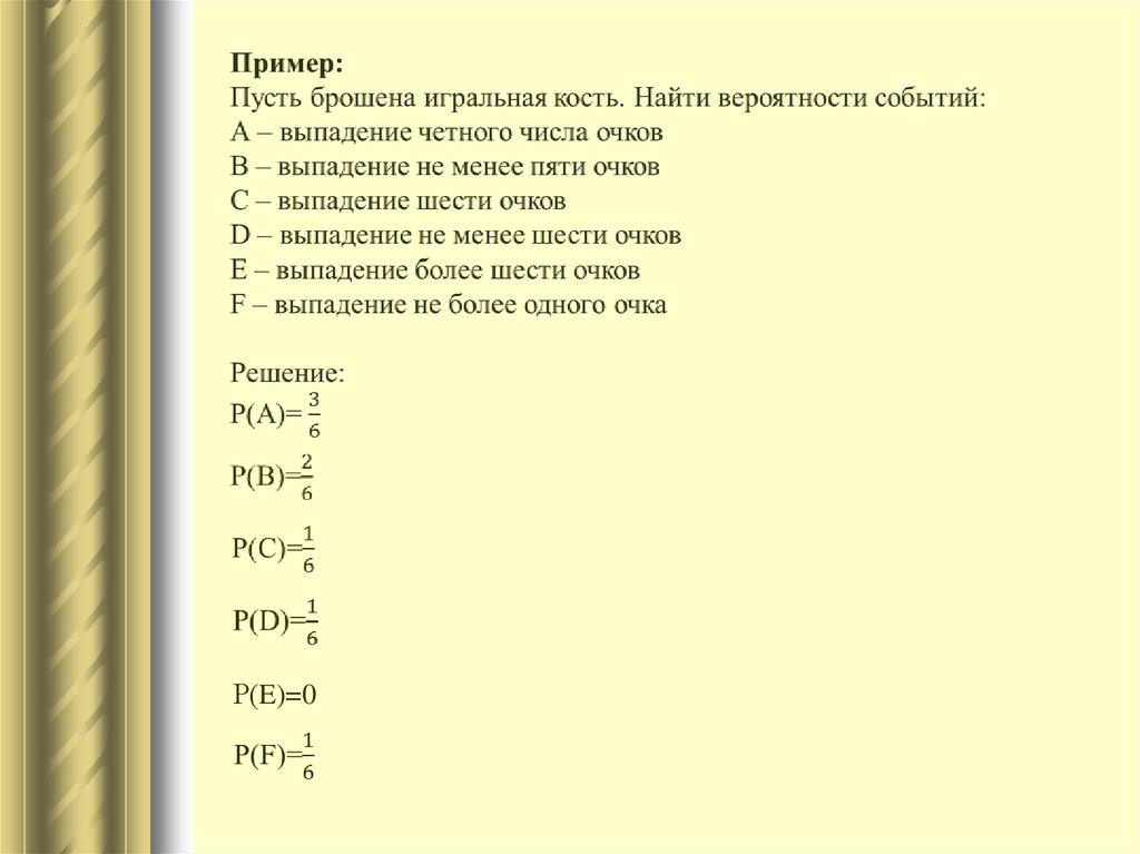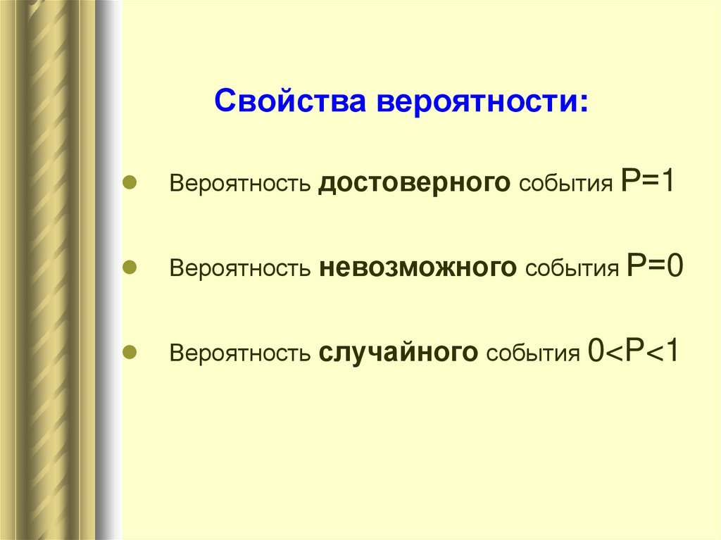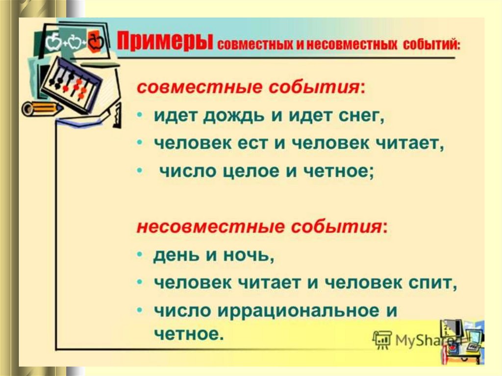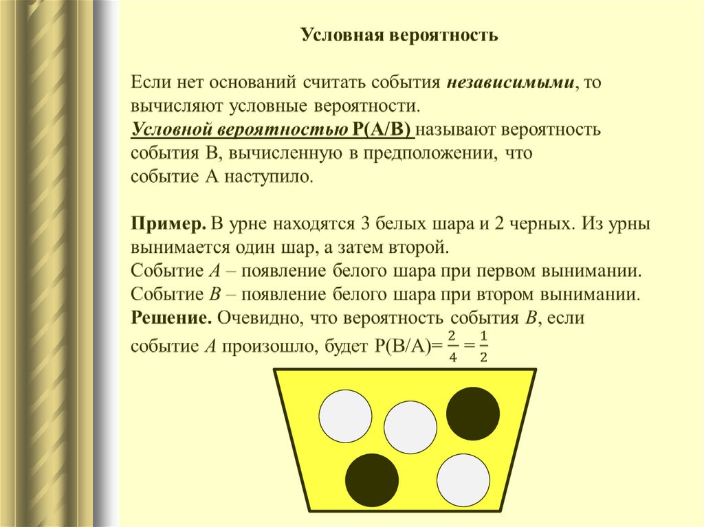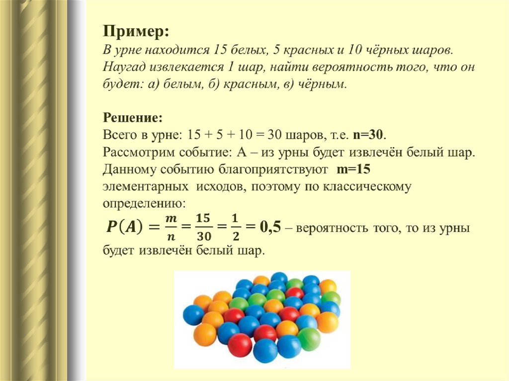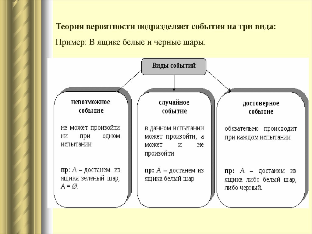 Теория вероятности подразделяет события на три вида:Пример: В ящике белые и черные шары.
