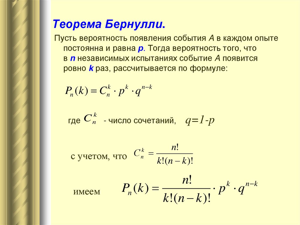 Теорема Бернулли.Пусть вероятность появления события A в каждом опыте