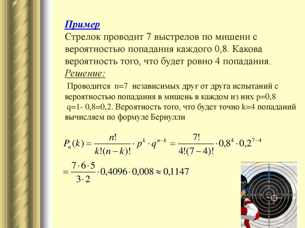 q=1- 0,8=0,2. Вероятность того, что будет точно k=4 попаданий