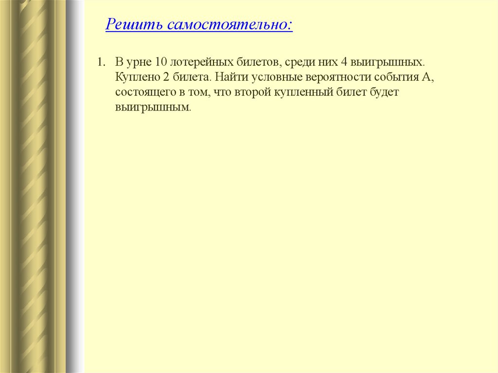 Решить самостоятельно:1. В урне 10 лотерейных билетов, среди них 4 выигрышных.