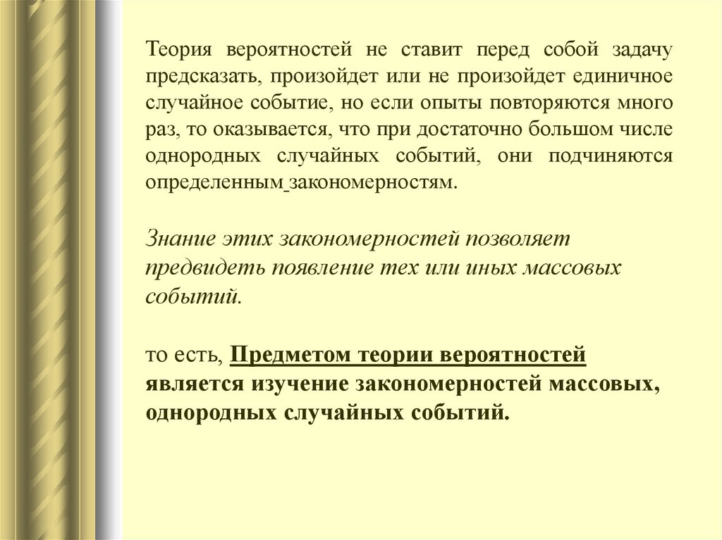Теория вероятностей не ставит перед собой задачупредсказать, произойдет или не произойдет единичное