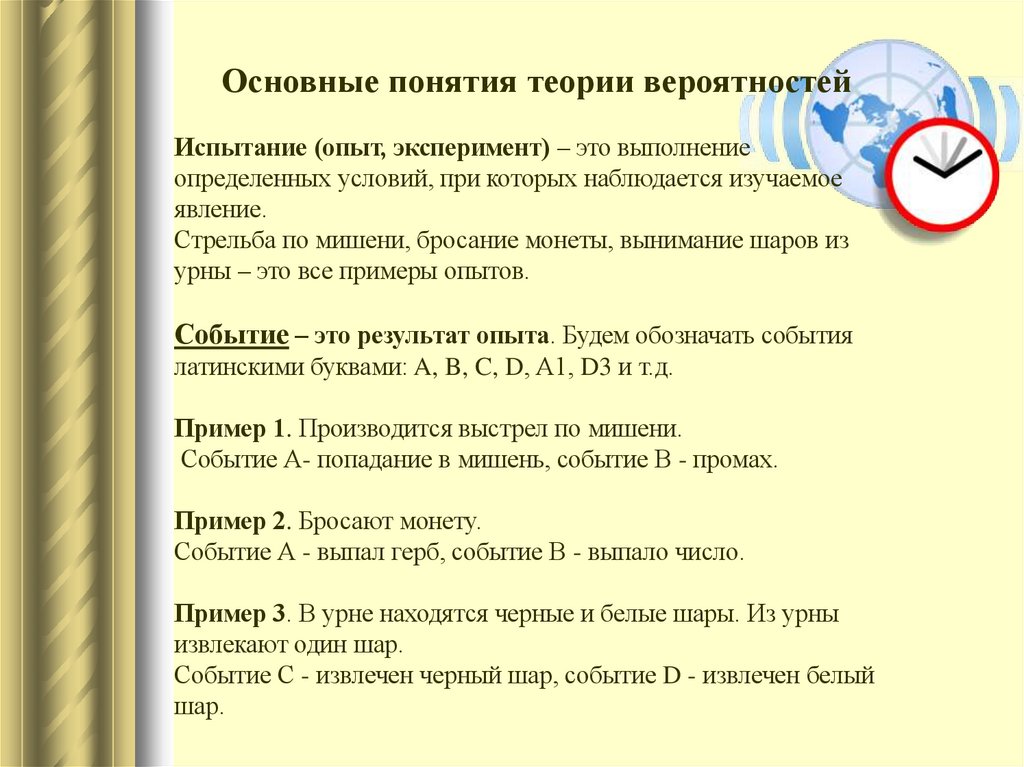 Основные понятия теории вероятностейИспытание (опыт, эксперимент) – это выполнение