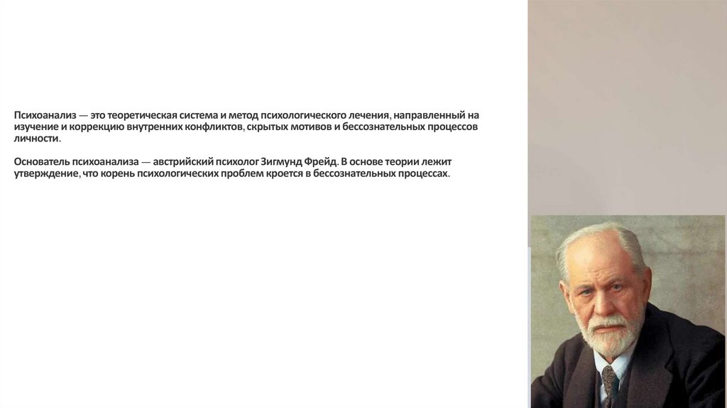 Психоанализ это теоретическая система и метод психологического лечения, направленный наизучение и коррекцию внутренних конфликтов, скрытых мотивов и бессознательных процессов