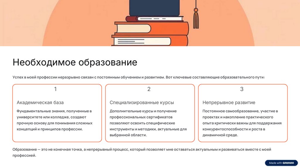 Необходимое образованиеУспех в моей профессии неразрывно связан с постоянным обучением и развитием. Вот ключевые составляющие образовательного пути:
