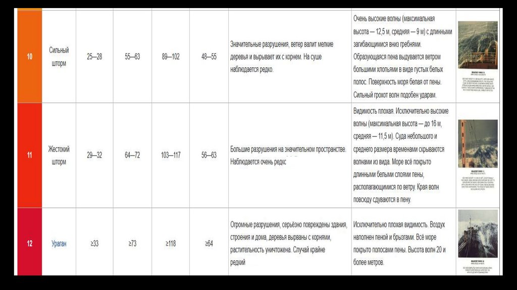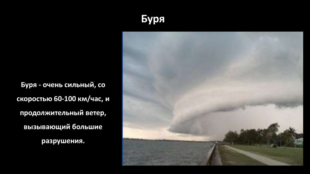 11. Буря - очень сильный, со скоростью 60-100 км/час, и продолжительный ветер, вызывающий большие разрушения.