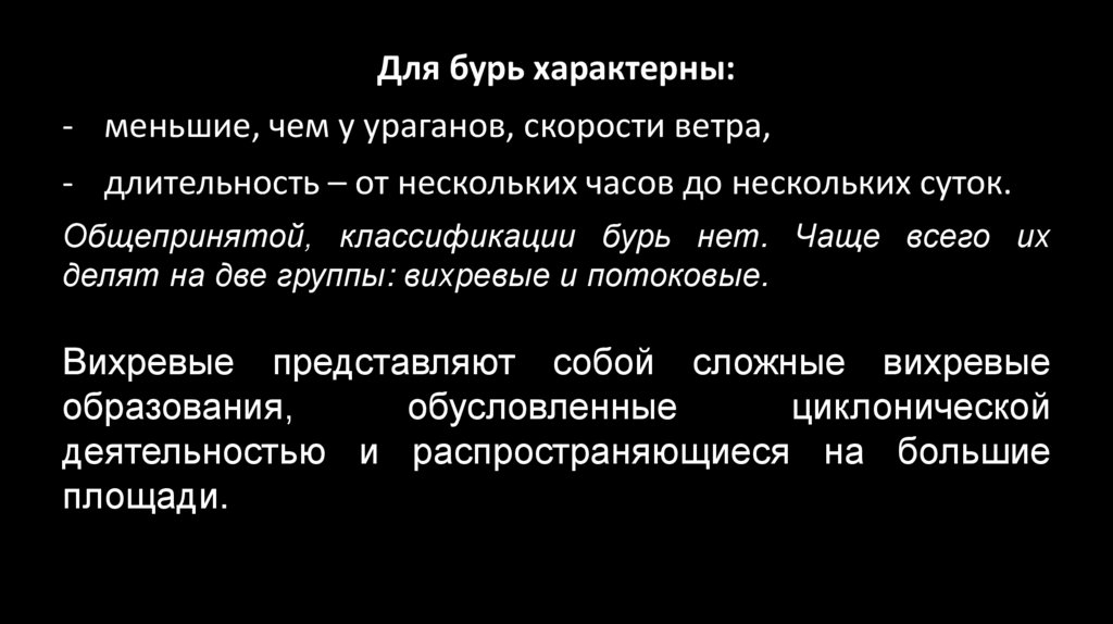 Для бурь характерны:- меньшие, чем у ураганов, скорости ветра,