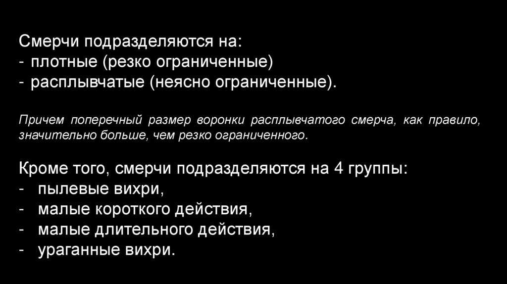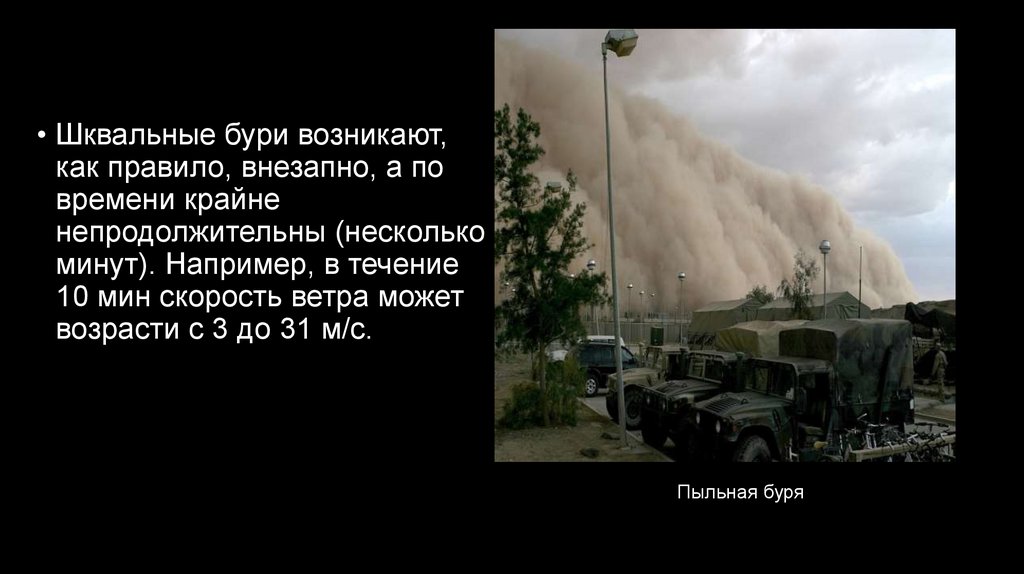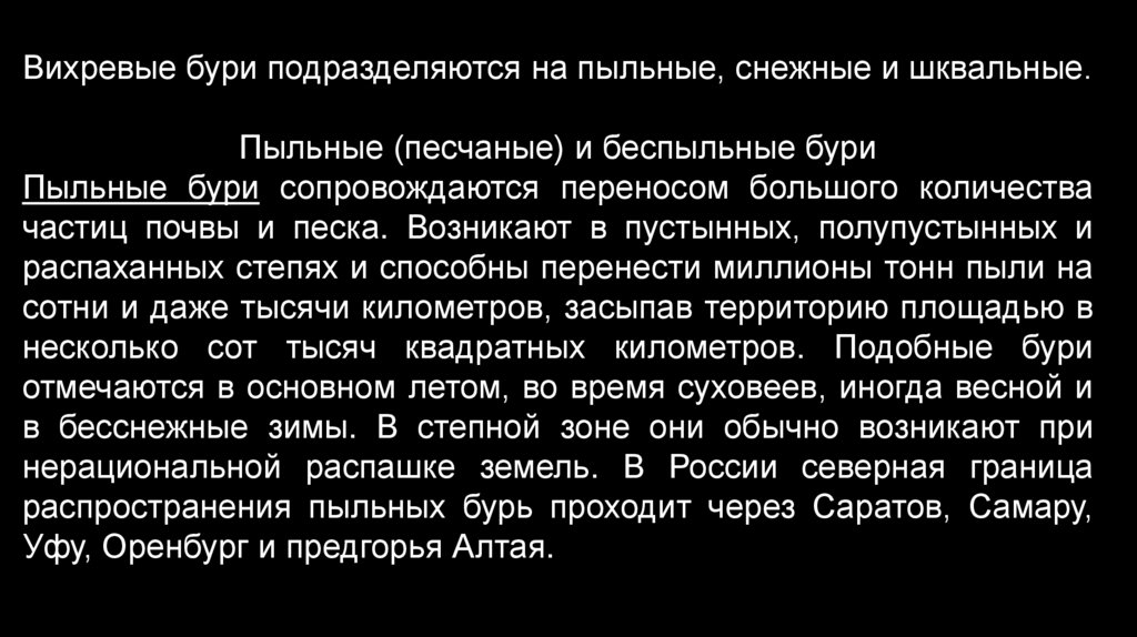 Вихревые бури подразделяются на пыльные, снежные и шквальные.Пыльные (песчаные) и беспыльные бури