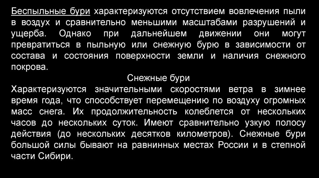Беспыльные бури характеризуются отсутствием вовлечения пылив воздух и сравнительно меньшими масштабами разрушений и