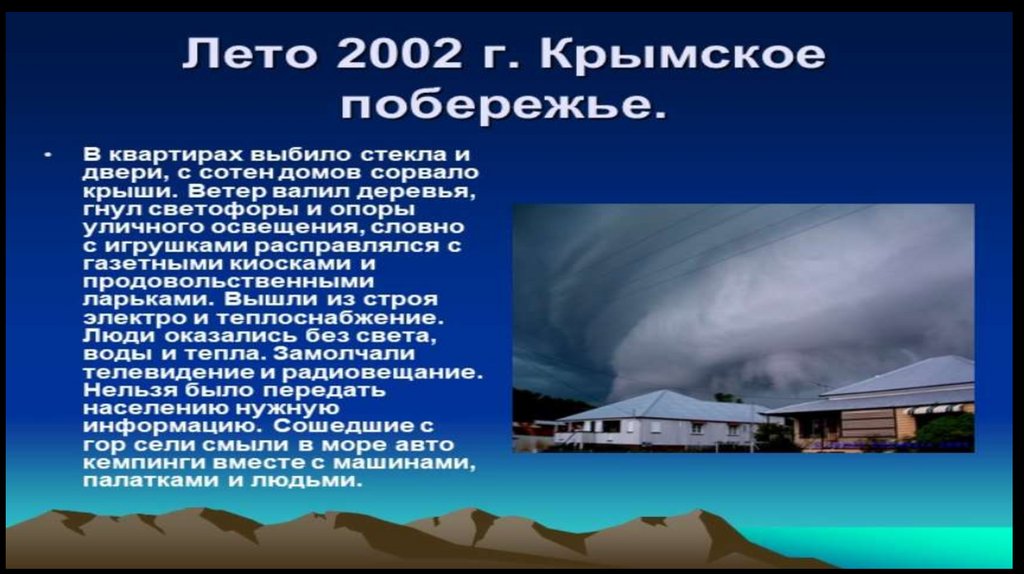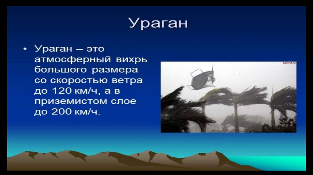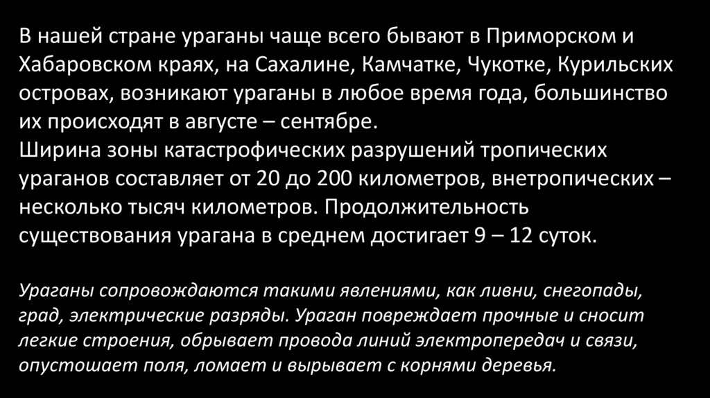 В нашей стране ураганы чаще всего бывают в Приморском иХабаровском краях, на Сахалине, Камчатке, Чукотке, Курильских