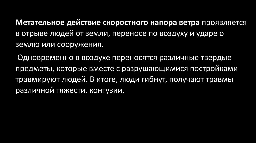 Метательное действие скоростного напора ветра проявляетсяв отрыве людей от земли, переносе по воздуху и ударе о
