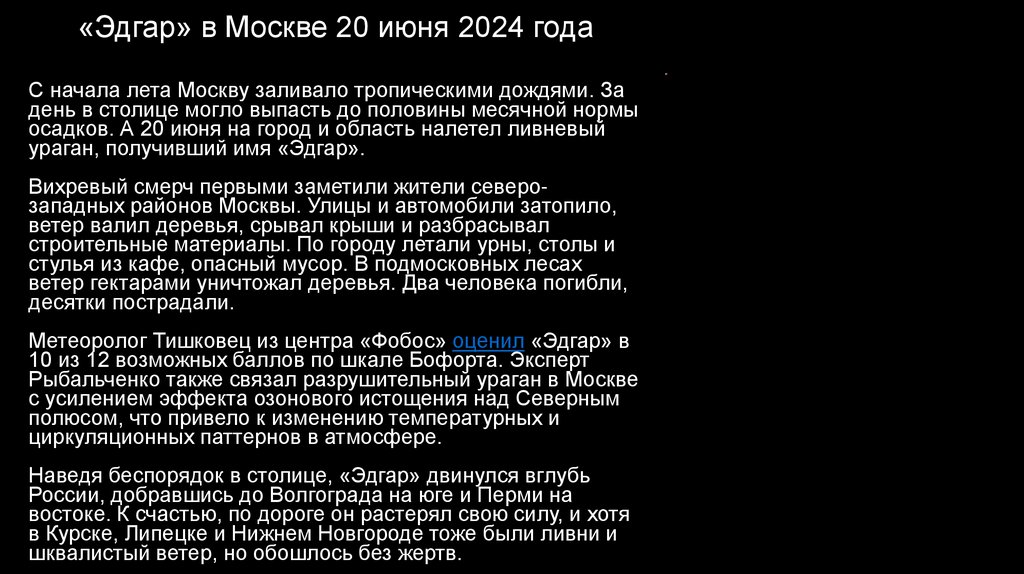 «Эдгар» в Москве 20 июня 2024 годаС начала лета Москву заливало тропическими дождями. За