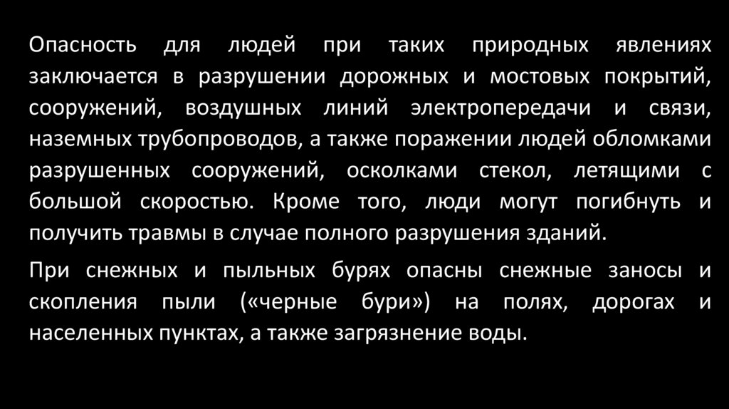 Опасность для людей при таких природных явленияхзаключается в разрушении дорожных и мостовых покрытий,