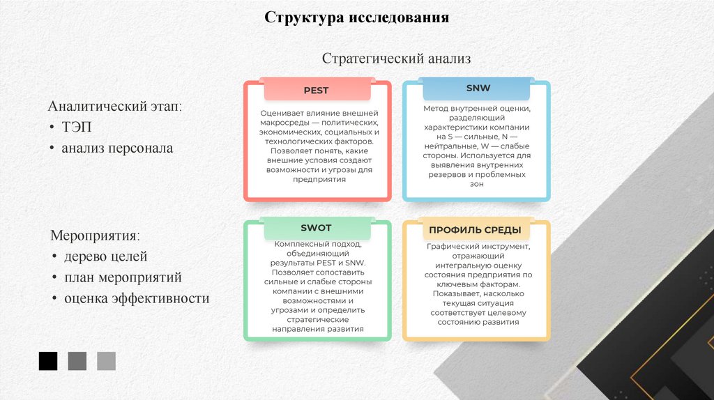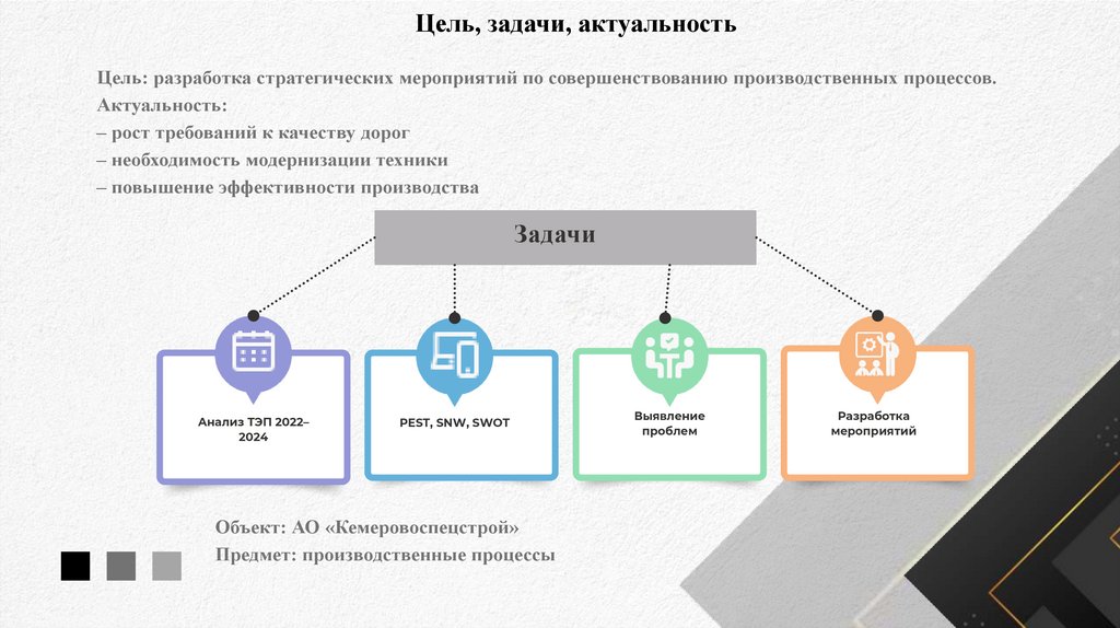 Цель, задачи, актуальностьЦель: разработка стратегических мероприятий по совершенствованию производственных процессов.