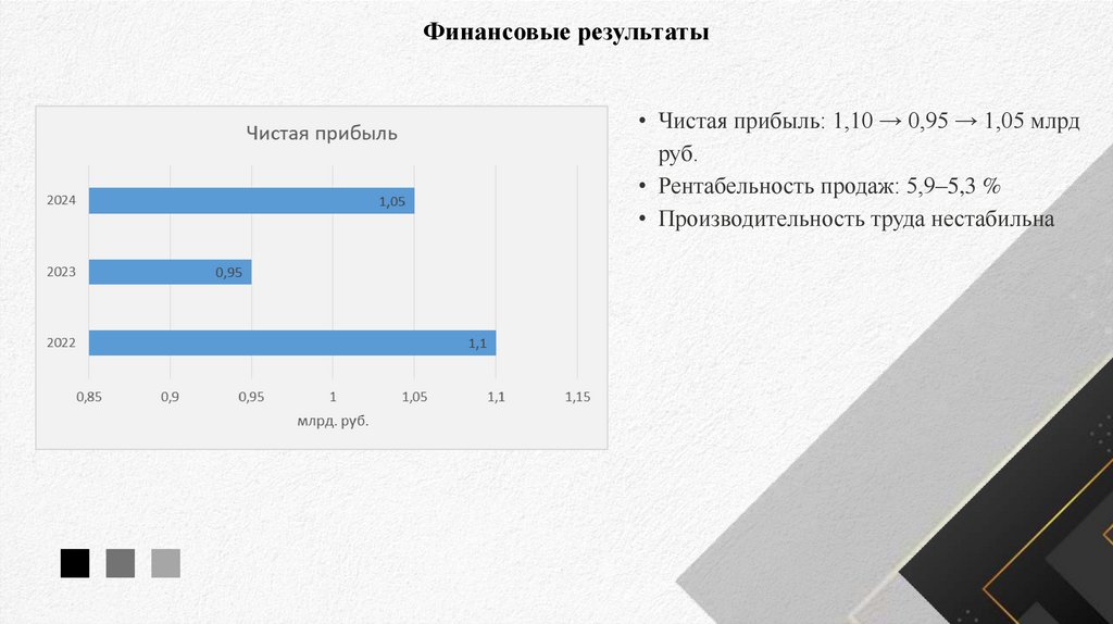 Финансовые результаты• Чистая прибыль: 1,10 → 0,95 → 1,05 млрд