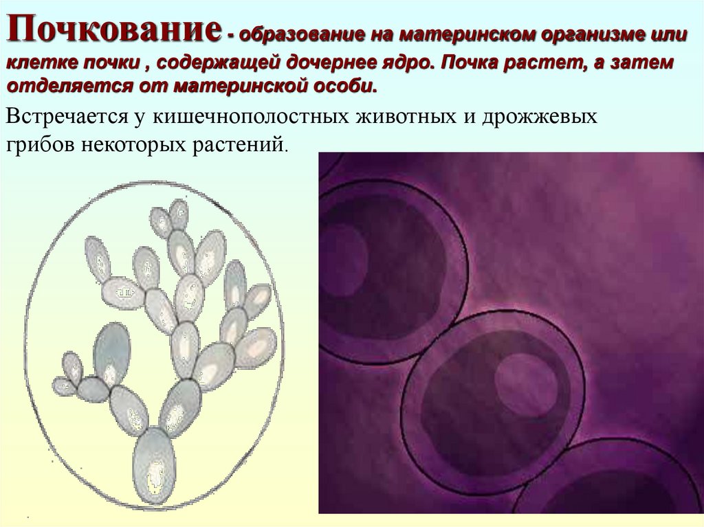 Почкование - образование на материнском организме иликлетке почки , содержащей дочернее ядро. Почка растет, а затем