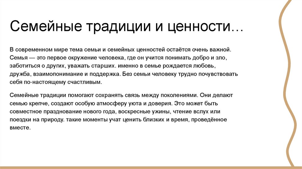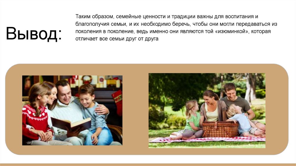 Таким образом, семейные ценности и традиции важны для воспитания иблагополучия семьи, и их необходимо беречь, чтобы они могли передаваться из