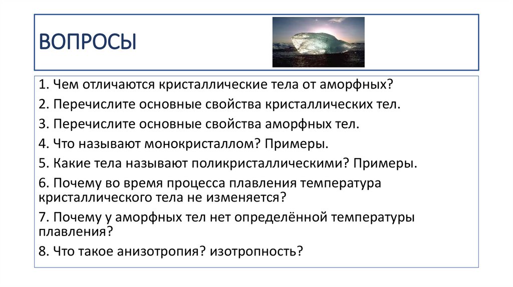 1. Чем отличаются кристаллические тела от аморфных?2. Перечислите основные свойства кристаллических тел.