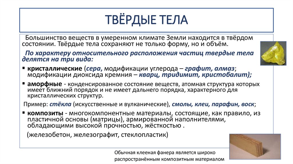 Большинство веществ в умеренном климате Земли находится в твёрдомсостоянии. Твёрдые тела сохраняют не только форму, но и объём.
