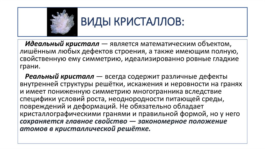 Идеальный кристалл — является математическим объектом,лишённым любых дефектов строения, а также имеющим полную,