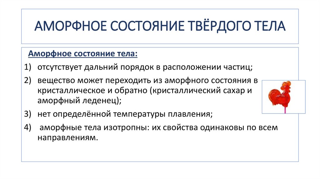 4) аморфные тела изотропны: их свойства одинаковы по всем