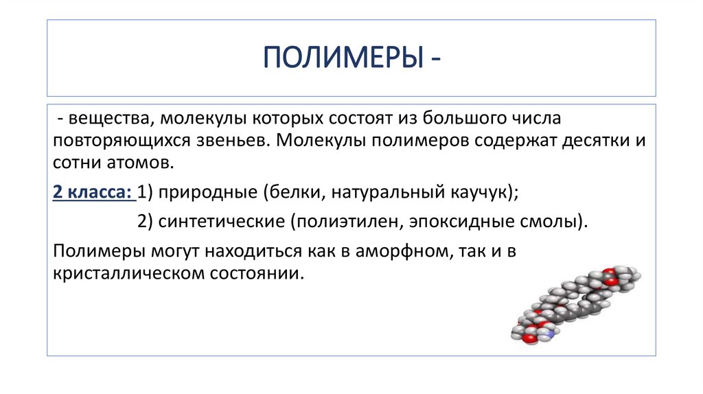 вещества, молекулы которых состоят из большого числаповторяющихся звеньев. Молекулы полимеров содержат десятки и