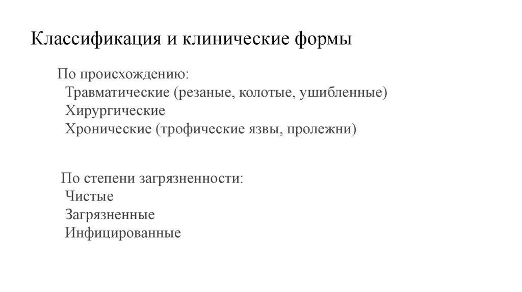 По происхождению:Травматические (резаные, колотые, ушибленные)
